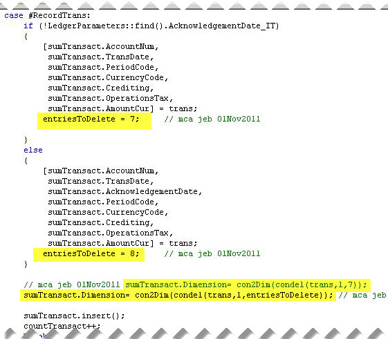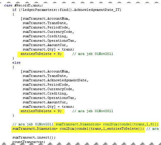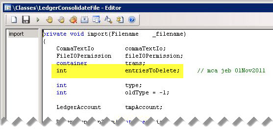 Class method LedgerConsolidateFile.import recognizes that the import file will contain a variable number of fields, but it fails to allow for that when it does a trim (condel) prior to looking at the dimensions.