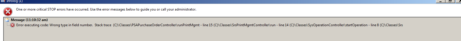When the users tried to confirm/print a purchase order in CU3, they got “Error executing code: Wrong type in field number. Stack Trace (C)\Classes\PSAPurchaseOrderController\runPrintMgmt – line 15 ….”