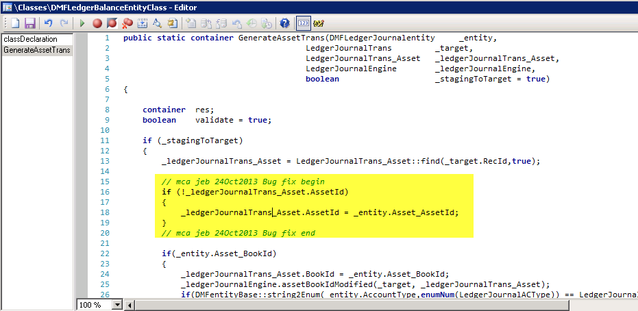 I found another potential bug. I haven’t the time at the moment to track down every detail, so I’m only calling it a potential bug. This one is in the Opening balances entity – when you import a Fixed asset type. The DMFLedgerBalanceEntityClass, which generates a record in LedgerJournalTrans, has a method to generate a corresponding record in LedgerJournalTrans_Asset. However, as far as I can tell, it does not populate the AssetId. So I threw in some code to fill it, and the functional person tells me it works (where it didn’t before).