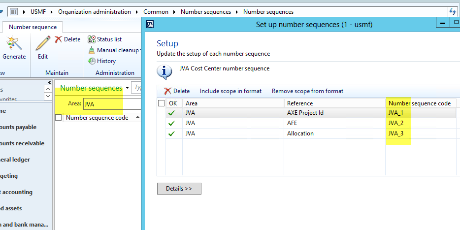 However, I could not find the last thing that I wanted to do: Put a specific prefix on the number sequence. It appears to default to the first four letters of the module’s name: Accounting sequences begin with Acco_ and our JointStuff sequences began with Join_. We wanted JVA, our prefix used elsewhere, instead.