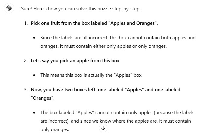 - Puzzle: There are three boxes, each with a label. One box contains only apples, another contains only oranges, and the third contains both apples and oranges. The boxes are labeled incorrectly. You are allowed to pick one fruit from one box. How can you determine which box contains what fruit?