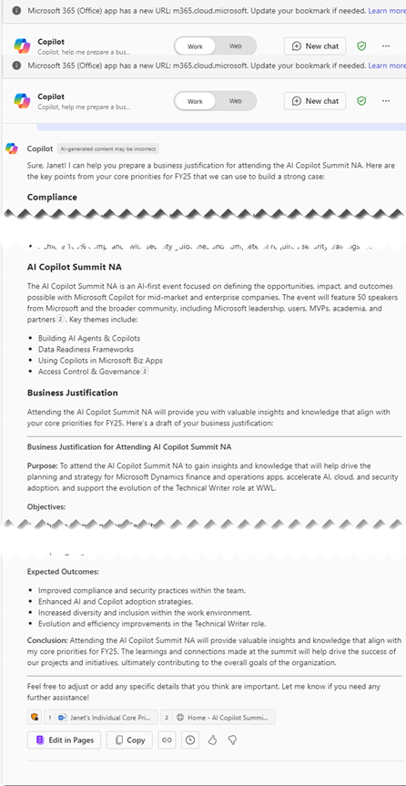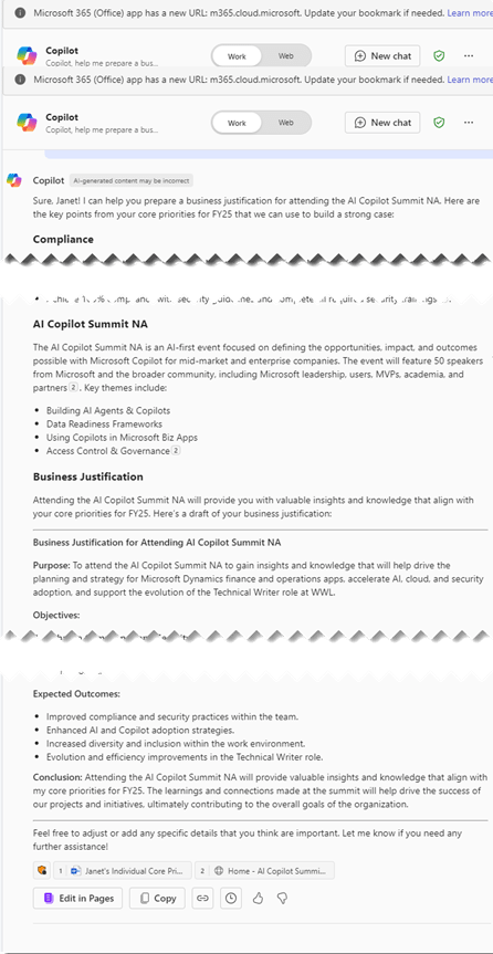 “Copilot, help me prepare a business justification to go to AI Copilot Summit NA. Its website is at copilot.summitna.com. My core priorities are <>”.